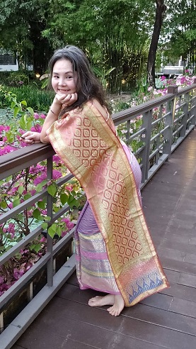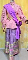 ผ้าสไบสีชมพูปักทอง ผ้าถุงม่วง |