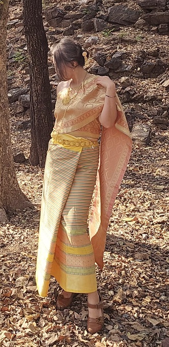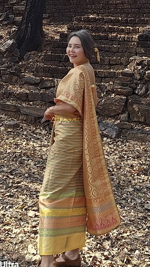 เสื้อคอป้ายสีเหลือง มีอก 38-48 ผ้าสไบสีชมพูปักทอง ผ้าถุงเหลือง |