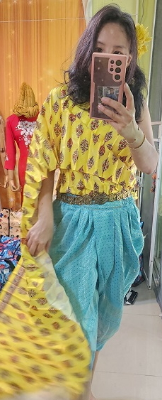 เสื้อคอป้ายสีเหลือง มีอก 38-48 ผ้าสไบสีชมพูปักทอง ผ้าถุงเหลือง |